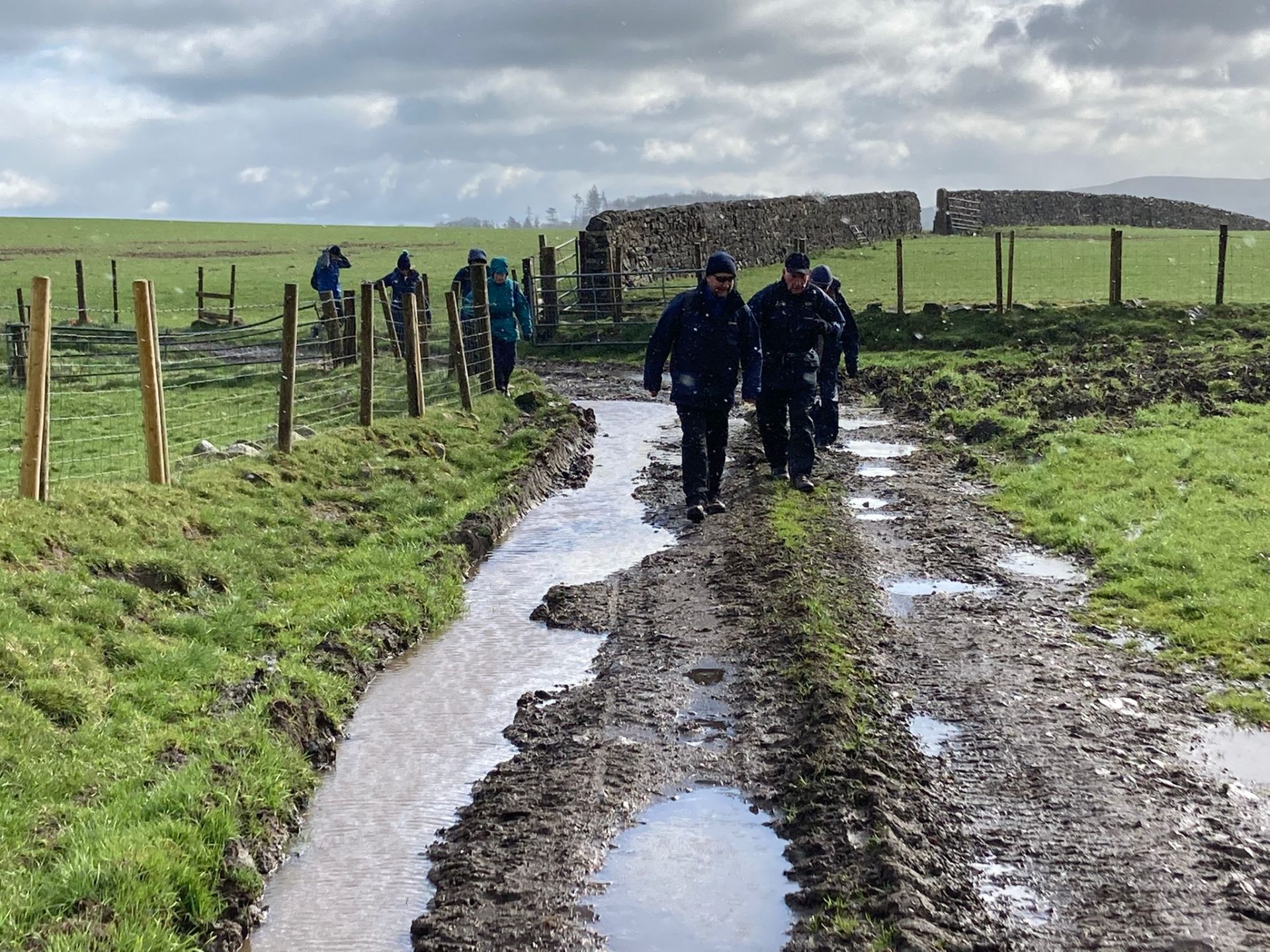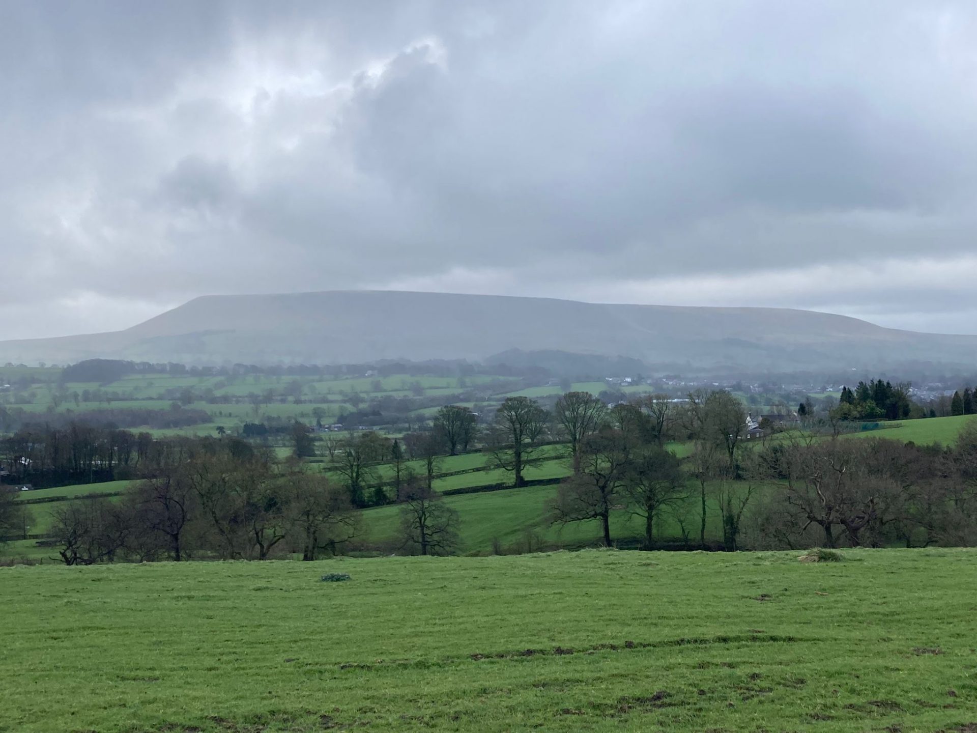 The route took us through several farm yards where we braved the barking, but thankfully, chained up dogs, and through several gardens where the bemused occupants looked out from their cosy houses with pity on the mud spattered bedraggled group yomping on the footpaths across their property. Following some steep tracks we ascended up to the trig point of Beacon hill, using a track aptly named Shivering Ginnel, through a plantation of very immature trees. Once at the top we had some great views across into Lancashire with the iconic Pendle Hill being visible through the rain, and further on to the Yorkshire Dales, Bowland Fells and the Ribble Valley.