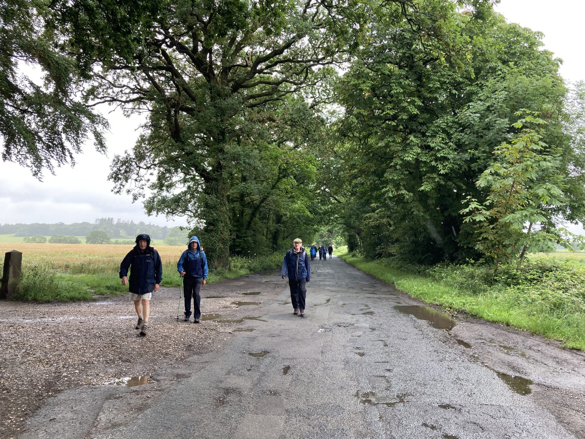 After over 100 days in lockdown the Rambling group finally managed to get out together today, and after all the lovely weather we have had, it absolutely poured down! Walking in groups of six, as per Government guidelines, we kept a social distance and covered the route of the Warhorse Walk from Ormskirk to Lathom Chapel. After a quick drink break we continued along very muddy paths, across lush overgrown fields to the site of the old Burscough priory where we had a standing up lunch. Suitably refreshed we carried on through the countryside to Ruff Woods and back to the start point at Ormskirk station. 17 people walked and everyone was in a cheerful mood in spite of the weather, as it was good to get out together as a group in spite of the strange configuration we had to adopt. Hopefully this will be the restart of our walking programme but we are mindful that the rules are constantly changing and so will be keeping to local walks as much as possible for the foreseeable future. In spite of the rain it was good to see the gang back together, even if it was 2 metres apart!